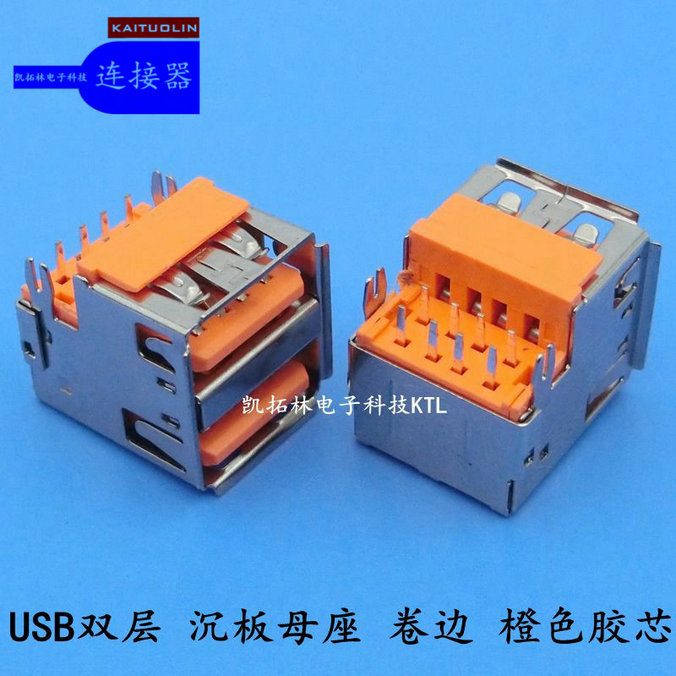 生产USB母座双层沉板卷边橙色胶芯充电接...